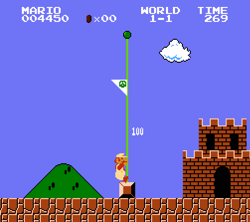 • The winning game state and flagpole animation when Mario reaches the end of the level